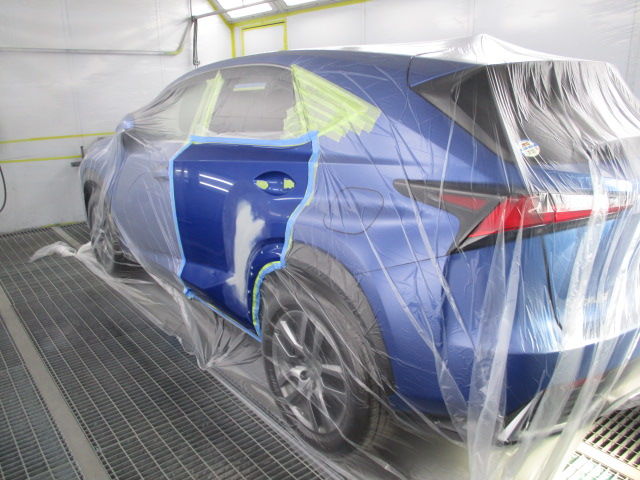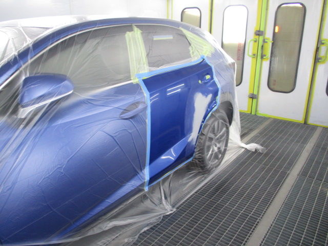UVサフェーサーを研磨後に塗装パネルを足付け作業しいよいよ塗装です。レクサスのクリアコートには特徴があり「セルフ・リストアリング・コート」と呼ばれるものが採用されています。(一部トヨタ車の高級車や高級オプション塗装などにも採用されております)このクリアは洗車キズや細かい傷を自己修復する塗装になっており、5年~8年の間新車の綺麗さをキープしてくれる(メーカー発表)塗装です。